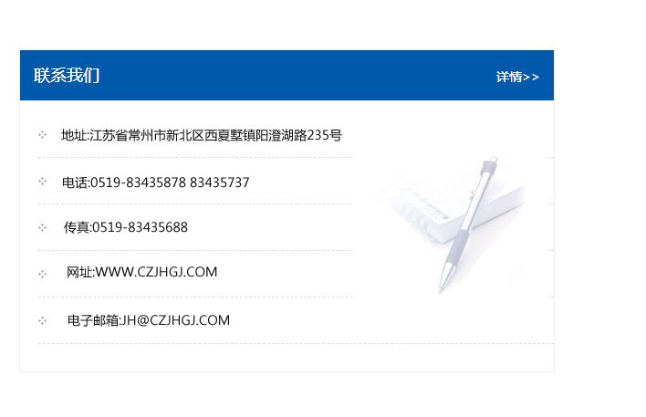 地址:常州市新北區友邦商務大廈1幢16、17層  電話:0519-85101652  傳真:0519-85112595  郵編:213022  網址:www.cz-jiayue_cn.yjzyc.com  郵箱:xiajifengaa@163.com